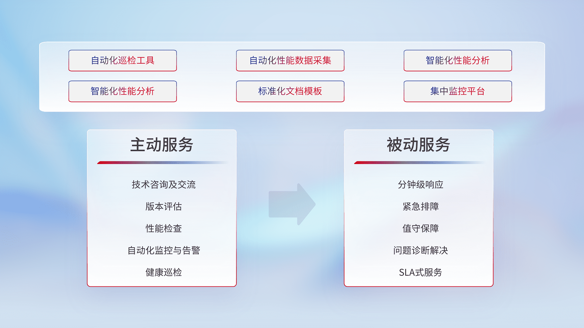 智能化工具和标准化文档,,,,保障服务质量,,,提供主动服务(包含技术咨询、、、版本评估、、、、性能检查、、、、自动化监控与告警、、、健康巡检)和被动服务包含(分钟级响应、、、紧急排障、、、值守保障、、、、问题诊断解决、、、SLA服务)。。